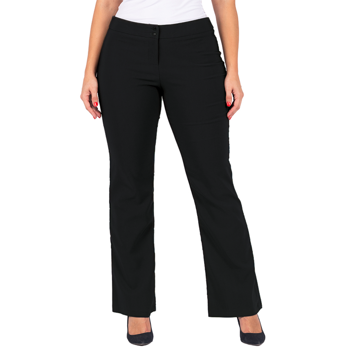 The figure-flattering mid-rise fit and subtle bootcut silhouette provide a polished, tailored appearance that maintains a clean, professional line, effortlessly accommodating your footwear. The smooth, flat front ensures a streamlined look that pairs perfectly with blazers, uniform shirts, and dress blouses.