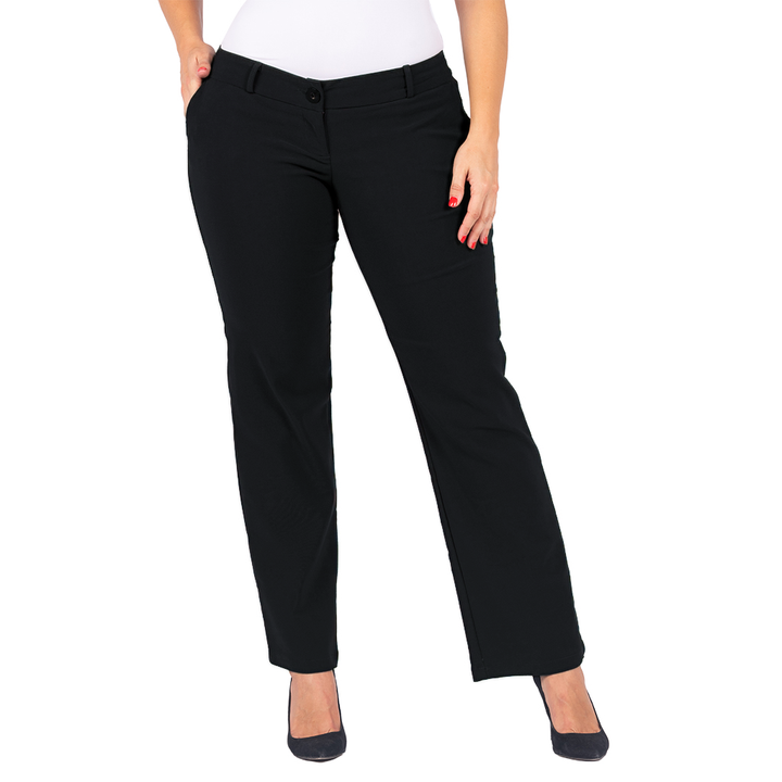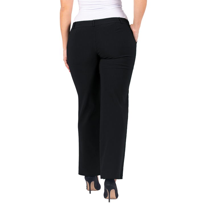 The figure-flattering mid-rise fit and subtle bootcut silhouette provide a polished, tailored appearance that maintains a clean, professional line, effortlessly accommodating your footwear. The smooth, flat front ensures a streamlined look that pairs perfectly with blazers, uniform shirts, and dress blouses.