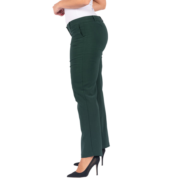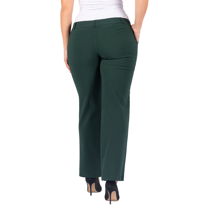 The figure-flattering mid-rise fit and subtle bootcut silhouette provide a polished, tailored appearance that maintains a clean, professional line, effortlessly accommodating your footwear. The smooth, flat front ensures a streamlined look that pairs perfectly with blazers, uniform shirts, and dress blouses.