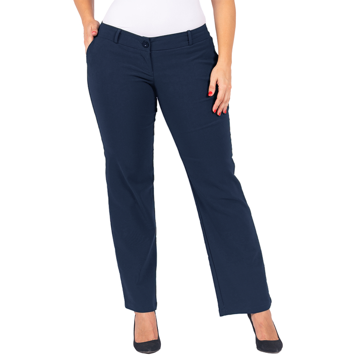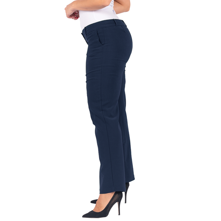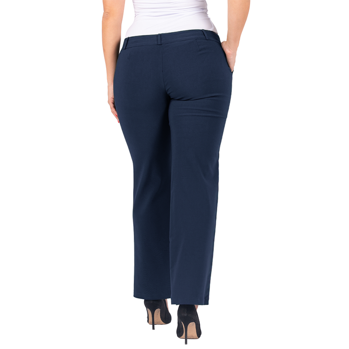 The figure-flattering mid-rise fit and subtle bootcut silhouette provide a polished, tailored appearance that maintains a clean, professional line, effortlessly accommodating your footwear. The smooth, flat front ensures a streamlined look that pairs perfectly with blazers, uniform shirts, and dress blouses.
