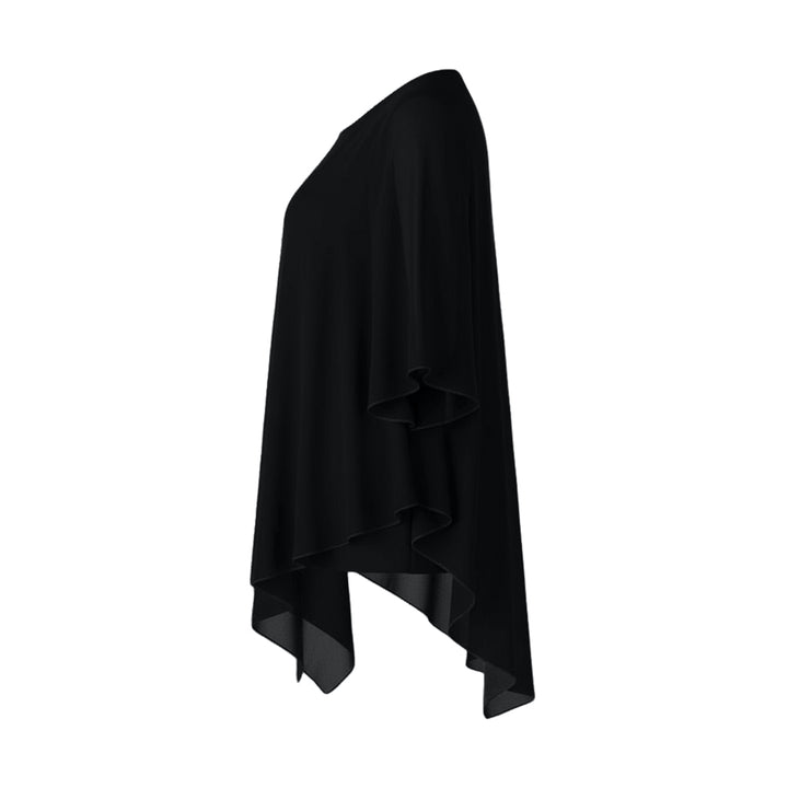 Features: Asymmetric hem, flutter sleeves, round neckline, luxurious drape.