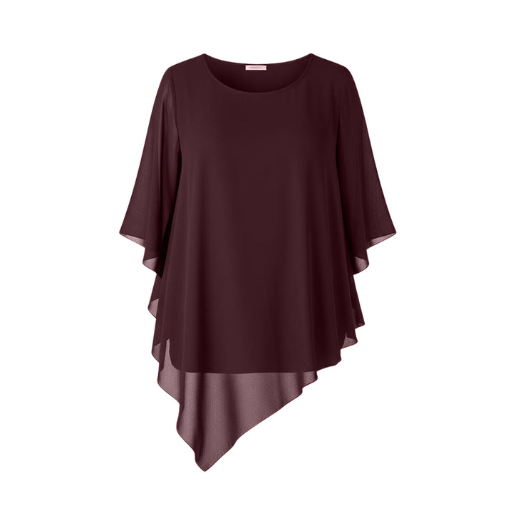 • Features: Asymmetric hem, flutter sleeves, round neckline, luxurious drape.