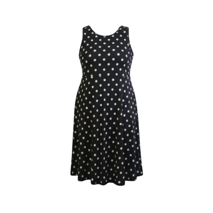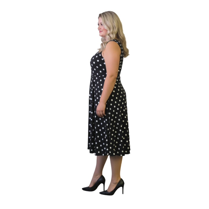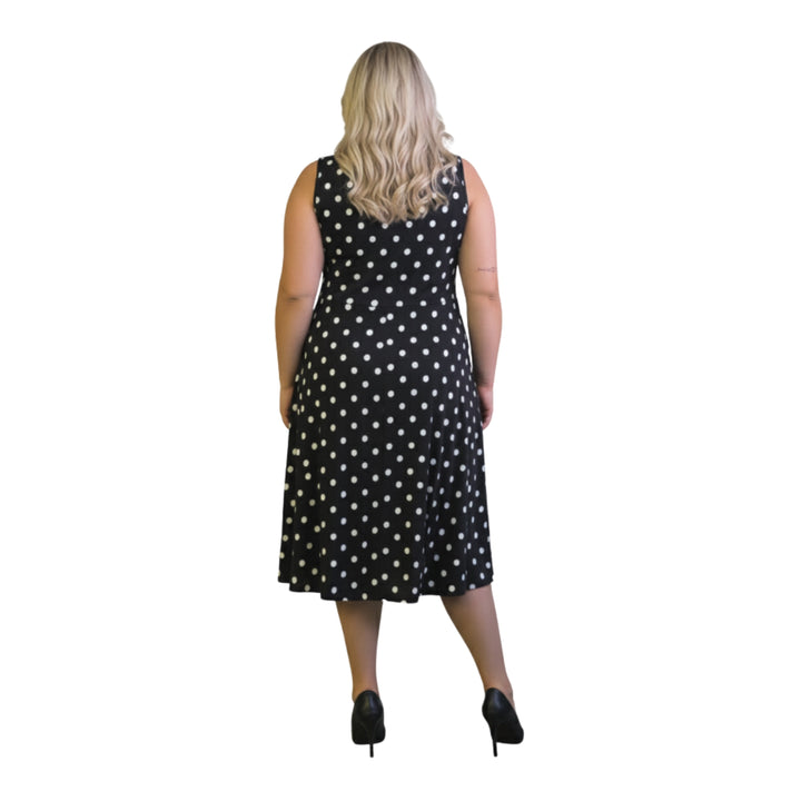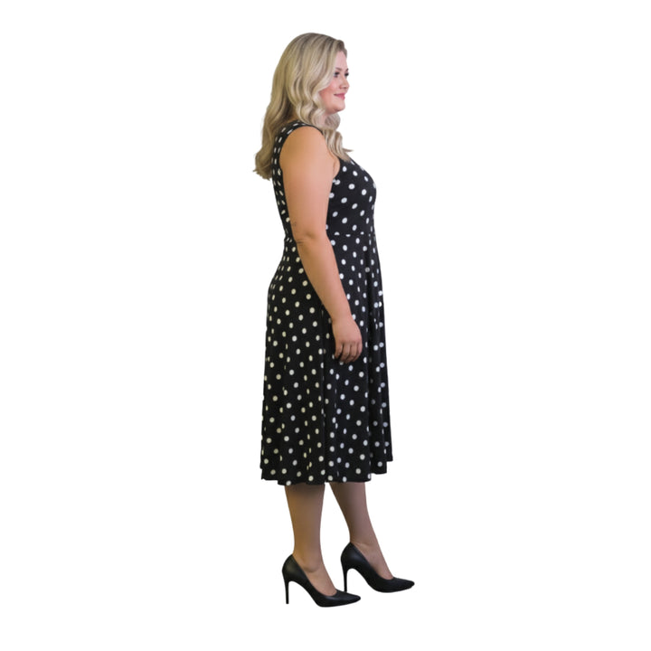 Step out in timeless style and head-turning elegance with the Printed Paula Polka Dot Dress. This classic piece is designed to celebrate your figure, featuring a vibrant black-and-white polka dot print that exudes playful sophistication. The sleeveless design and flattering fit-and-flare silhouette create a look that's instantly chic, comfortable, and ready for any occasion.