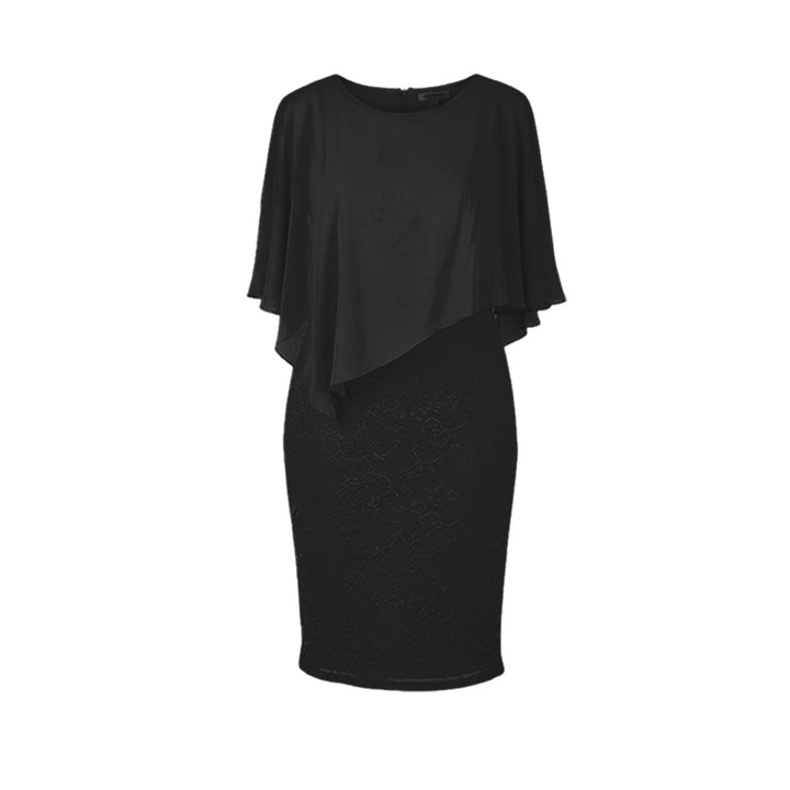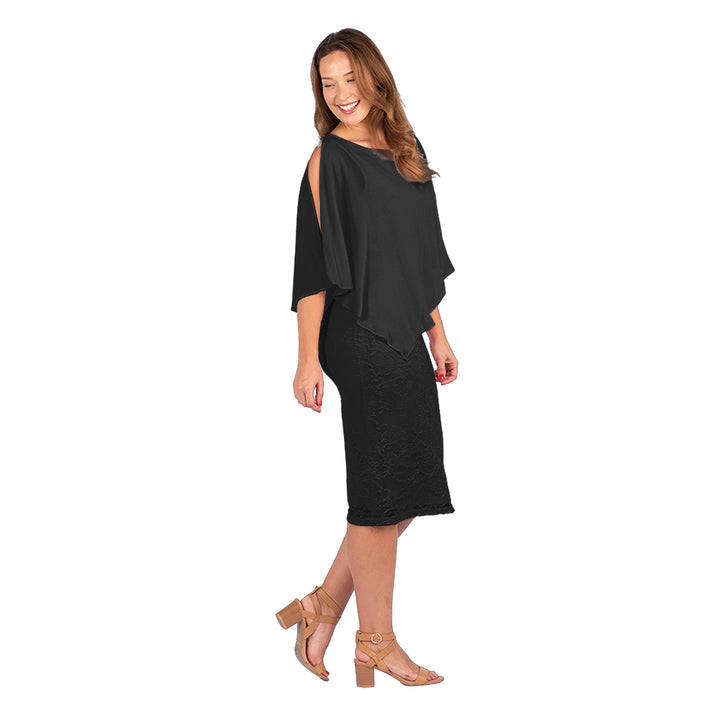 The dress features a chiffon-style asymmetric overlay that flows beautifully over the bust and hips, creating a universally flattering silhouette. This brilliant outer layer includes chic cold-shoulder cut-outs and a gentle bateau neckline. The fitted underlayer of the dress is crafted from fully-lined tonal lace, adding rich texture and defining the figure from the waist to the knee.