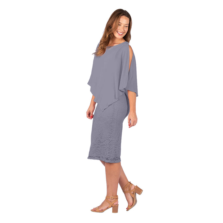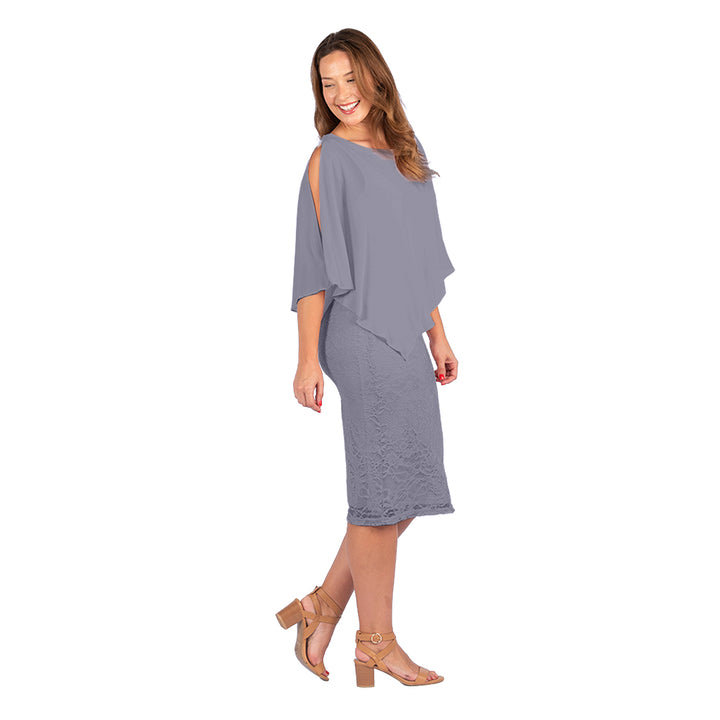 The dress features a chiffon-style asymmetric overlay that flows beautifully over the bust and hips, creating a universally flattering silhouette. This brilliant outer layer includes chic cold-shoulder cut-outs and a gentle bateau neckline. The fitted underlayer of the dress is crafted from fully-lined tonal lace, adding rich texture and defining the figure from the waist to the knee.
