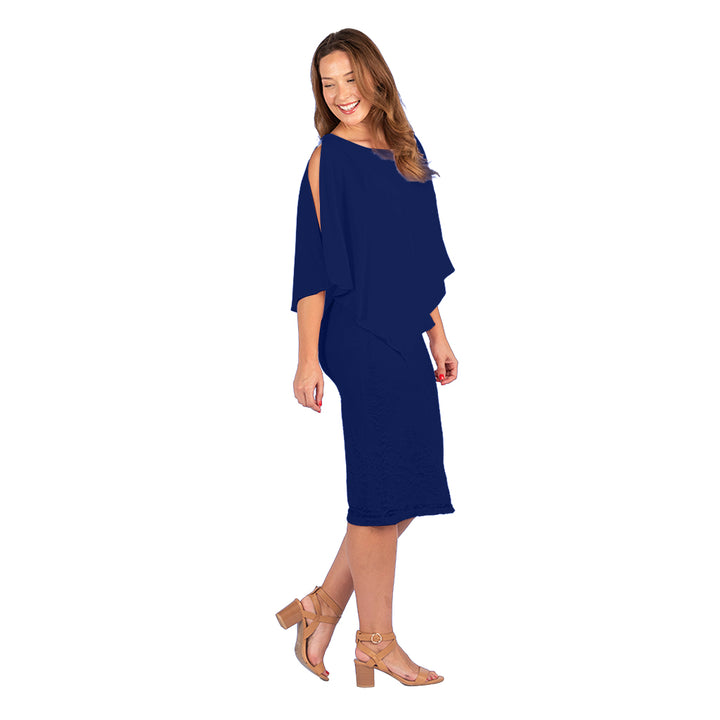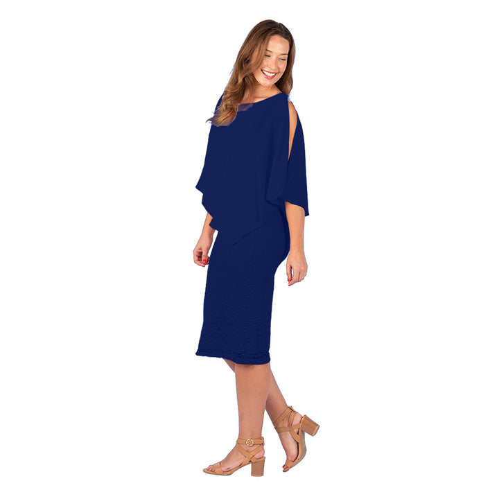 The dress features a chiffon-style asymmetric overlay that flows beautifully over the bust and hips, creating a universally flattering silhouette. This brilliant outer layer includes chic cold-shoulder cut-outs and a gentle bateau neckline. The fitted underlayer of the dress is crafted from fully-lined tonal lace, adding rich texture and defining the figure from the waist to the knee.