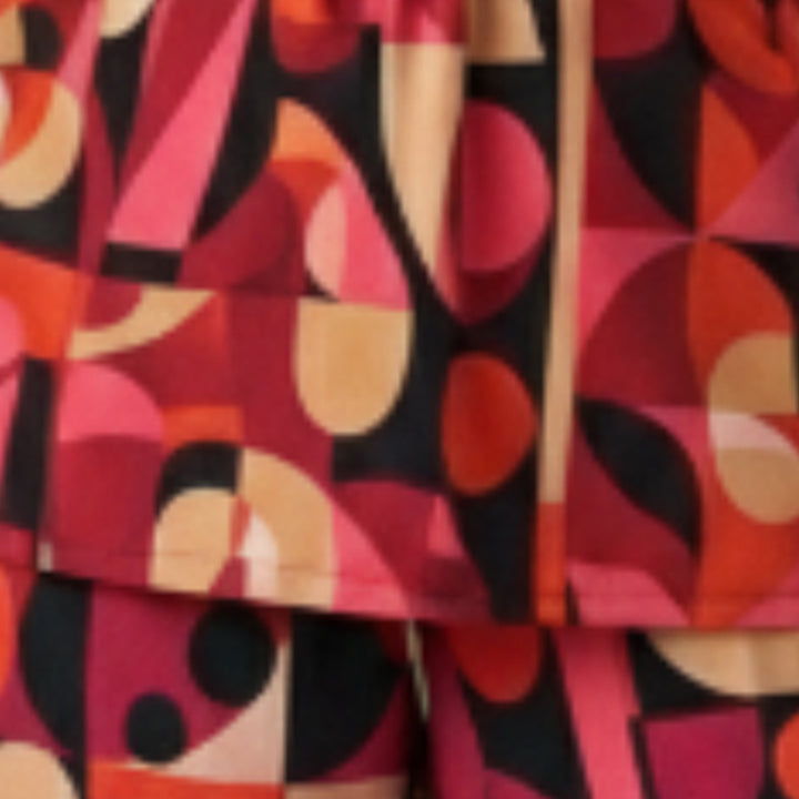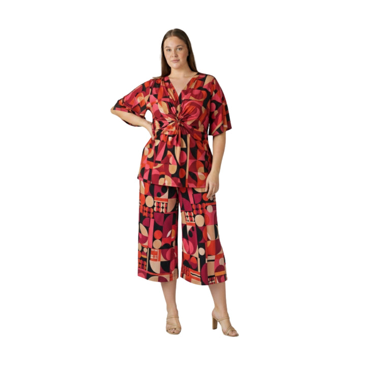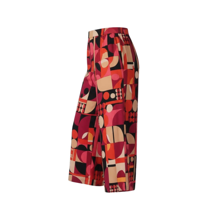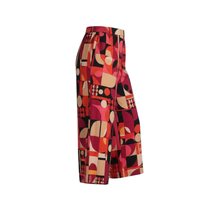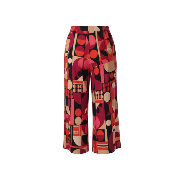 Make a bold statement in these eye-catching Geometric Print Wide-Leg Crop Pants! These pants feature a striking pattern of interlocking circles and shapes in a gorgeous palette of ruby red, berry pink, classic black, and warm beige—a truly unique design that elevates any outfit.