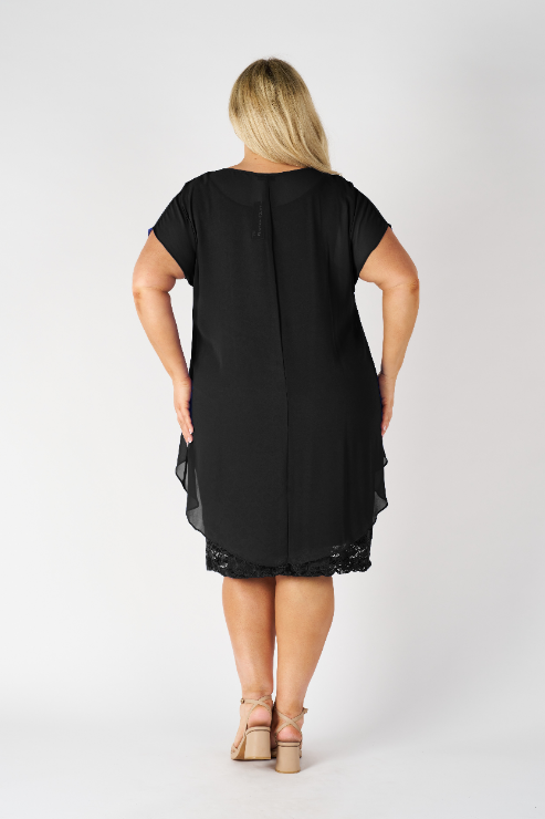 The inner layer is a beautifully tailored, fitted Lace Sheath Dress. The rich lace fabric provides texture and classic sophistication, while the internal lining is crafted from a smooth Polyester and Elastane blend. This ensures the dress moves with you and offers a comfortable, figure-flattering stretch.