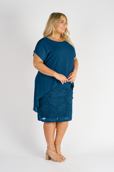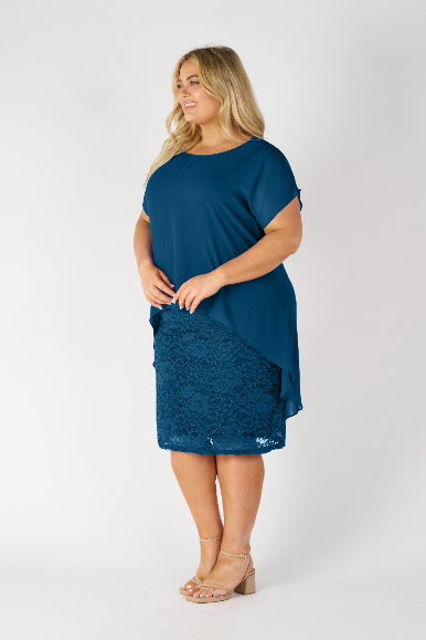 The inner layer is a beautifully tailored, fitted Lace Sheath Dress. The rich lace fabric provides texture and classic sophistication, while the internal lining is crafted from a smooth Polyester and Elastane blend. This ensures the dress moves with you and offers a comfortable, figure-flattering stretch.
