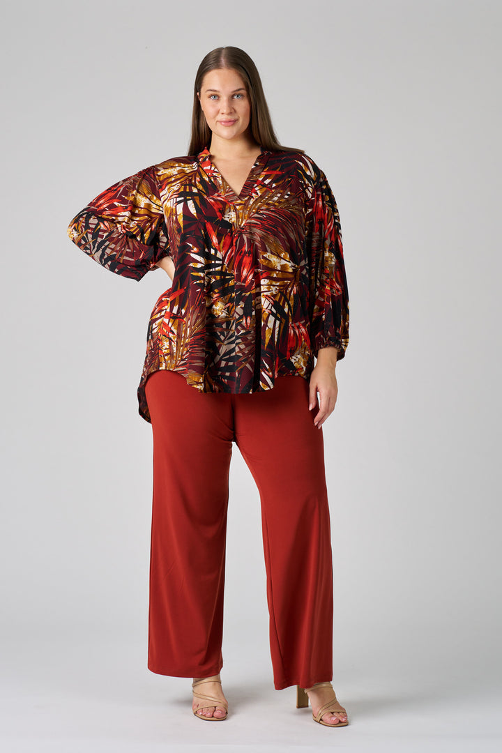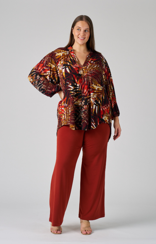 Add a touch of elegance to your wardrobe with the Inverted Pleat Front Blouse in a warm rust print. Designed with a flattering pleat detail at the front, this blouse creates a refined silhouette while offering comfortable movement. The flowy long sleeves and relaxed back make it easy to mix and match with your favourite skirts or trousers.