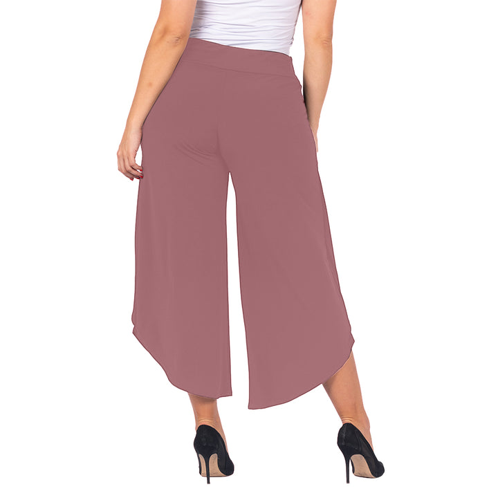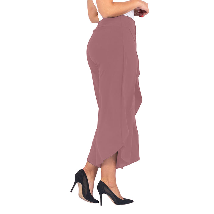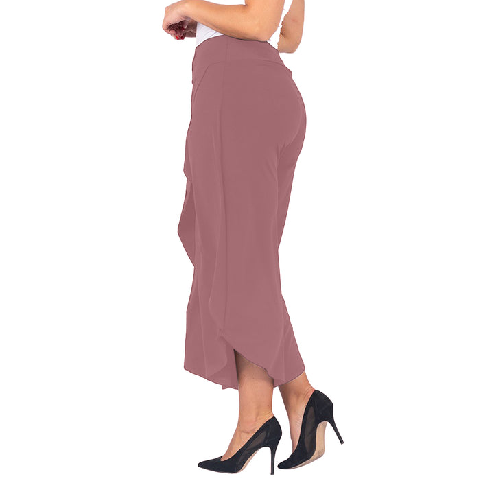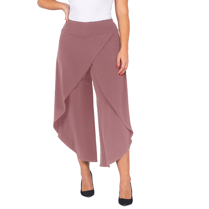 These stylish culottes offer the best of both worlds: the airy movement of a skirt with the practicality of trousers. The unique asymmetrical tulip hem and faux-wrap front create a graceful, flowing silhouette that flatters every figure. Whether you're dressing for a wedding or elevating your work-from-home look, these culottes are a versatile statement piece.