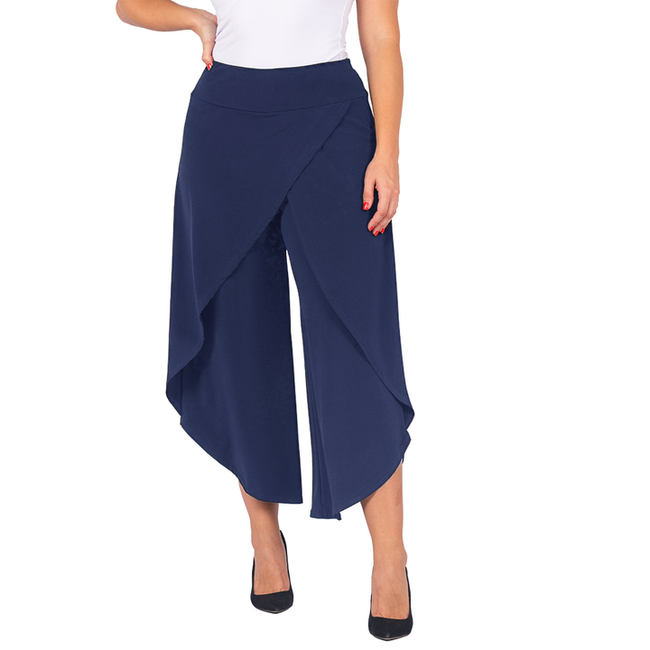 These stylish culottes offer the best of both worlds: the airy movement of a skirt with the practicality of trousers. The unique asymmetrical tulip hem and faux-wrap front create a graceful, flowing silhouette that flatters every figure. Whether you're dressing for a wedding or elevating your work-from-home look, these culottes are a versatile statement piece.