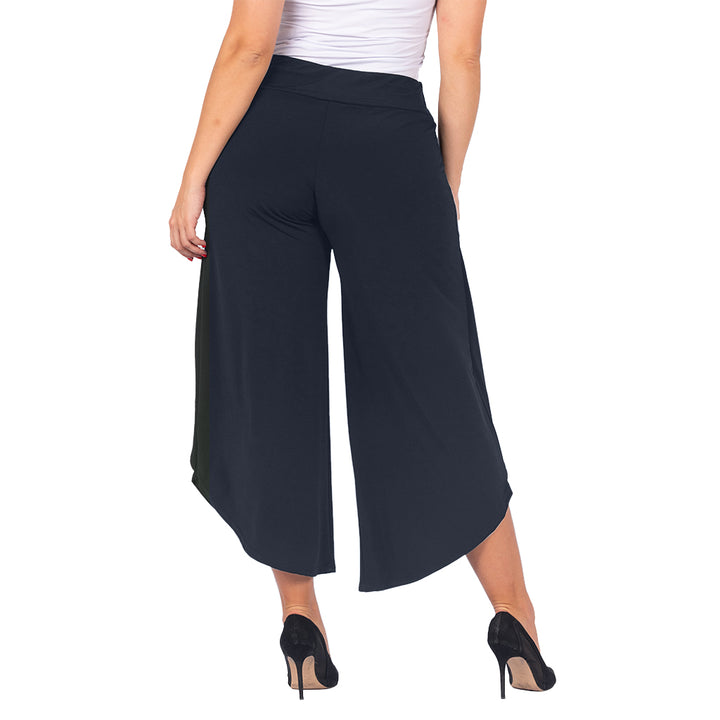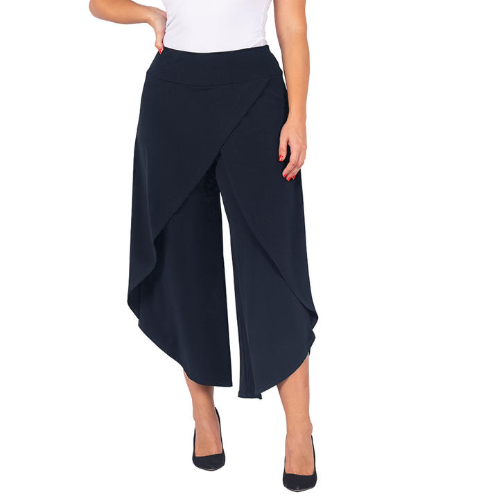These stylish culottes offer the best of both worlds: the airy movement of a skirt with the practicality of trousers. The unique asymmetrical tulip hem and faux-wrap front create a graceful, flowing silhouette that flatters every figure. Whether you're dressing for a wedding or elevating your work-from-home look, these culottes are a versatile statement piece.