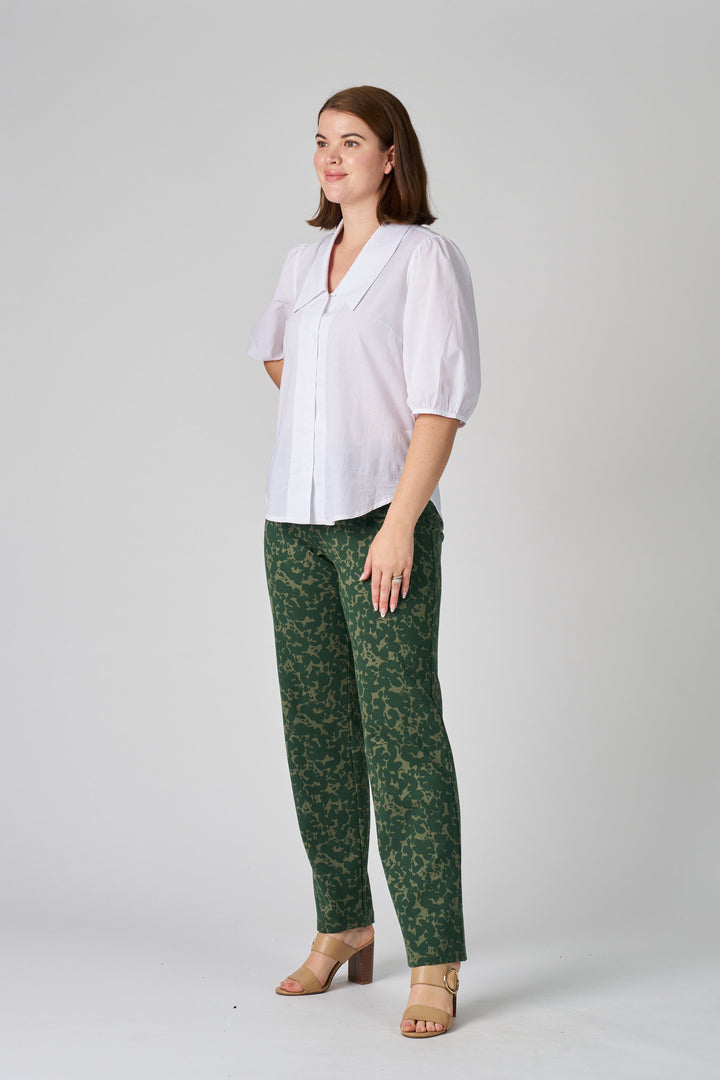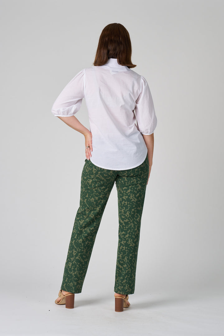 Introducing your new favorite everyday pant. These comfortable, stylish trousers feature a beautiful organic-inspired green print that's versatile enough for any season. Crafted from a premium cotton-spandex blend, they offer the classic breathability of cotton with the perfect amount of stretch for a fit that moves with you. The straight-leg cut is a timeless silhouette, making them easy to dress up or down.