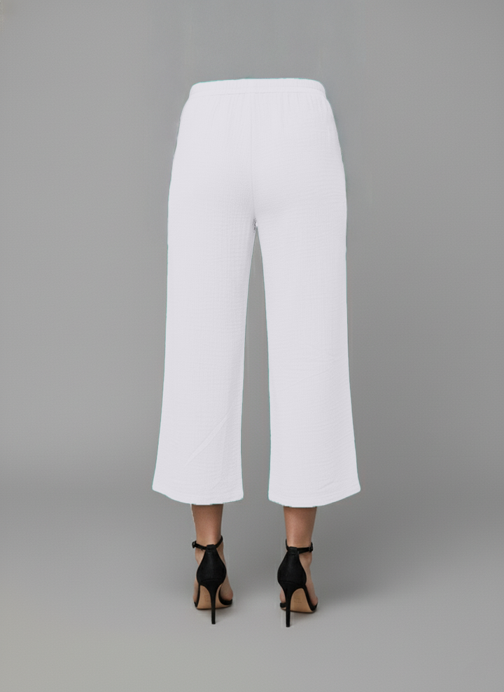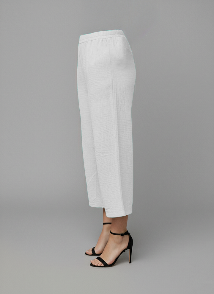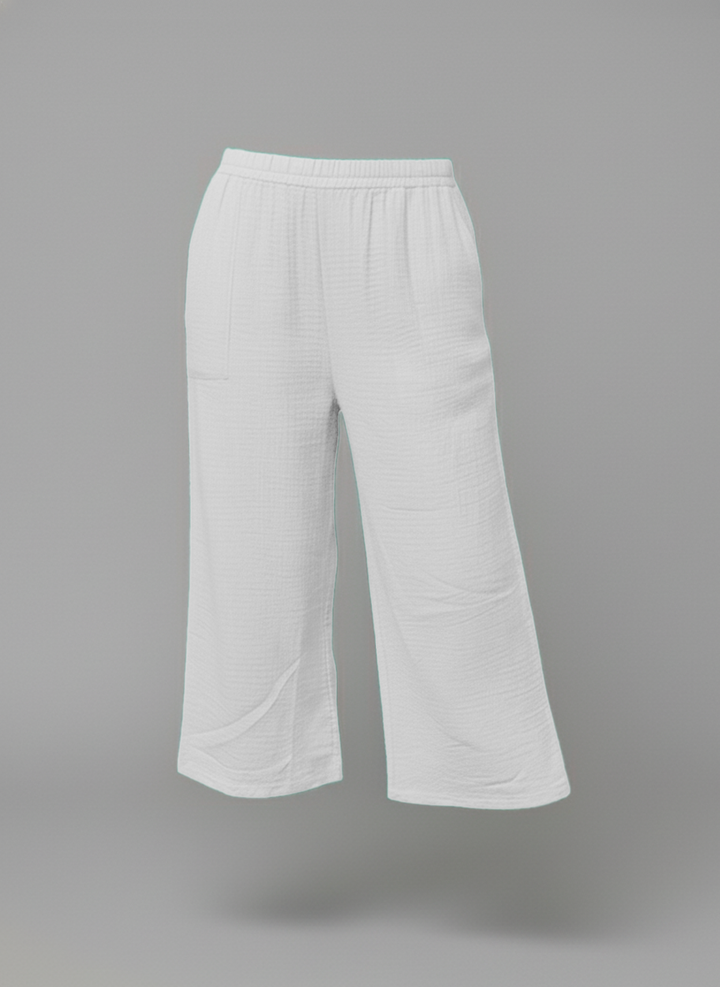 Embrace lightweight comfort with our signature wide-leg cropped pants. Crafted from a premium 100% Cotton double cloth fabric, these trousers are exceptionally soft, breathable, and feature a beautifully crinkled, textured finish. The wide-leg cut and cropped hem create a flattering, breezy silhouette that is perfect for warmer weather.