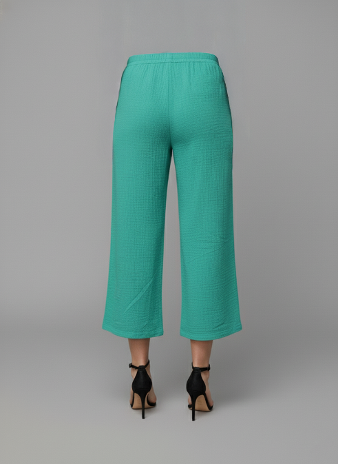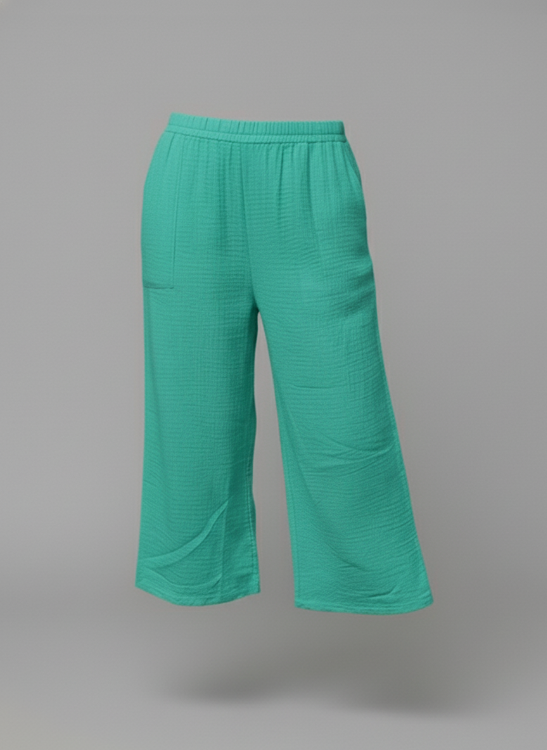Embrace lightweight comfort with our signature wide-leg cropped pants. Crafted from a premium 100% Cotton double cloth fabric, these trousers are exceptionally soft, breathable, and feature a beautifully crinkled, textured finish. The wide-leg cut and cropped hem create a flattering, breezy silhouette that is perfect for warmer weather.