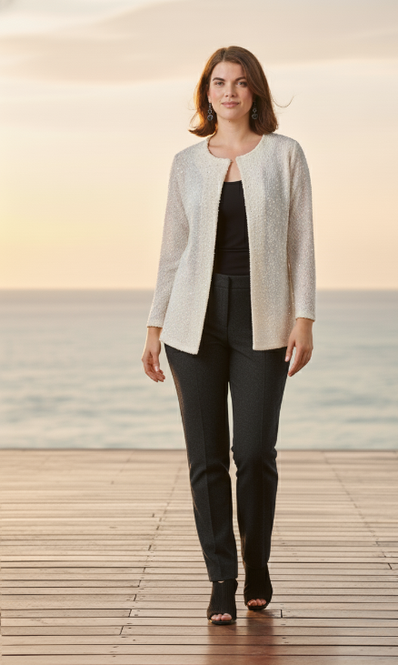 • Formal Evening: Layer it over a sleek black tank or camisole and pair it with wide-leg trousers (as pictured) or a maxi skirt for an elegant wedding guest or cruise look.