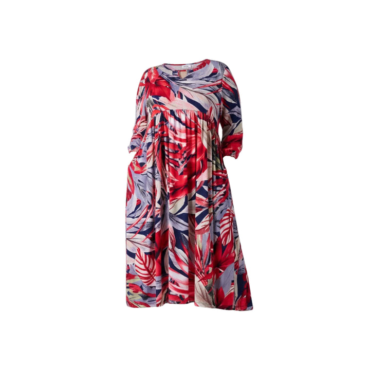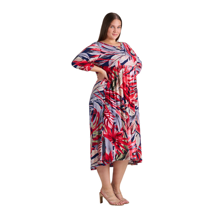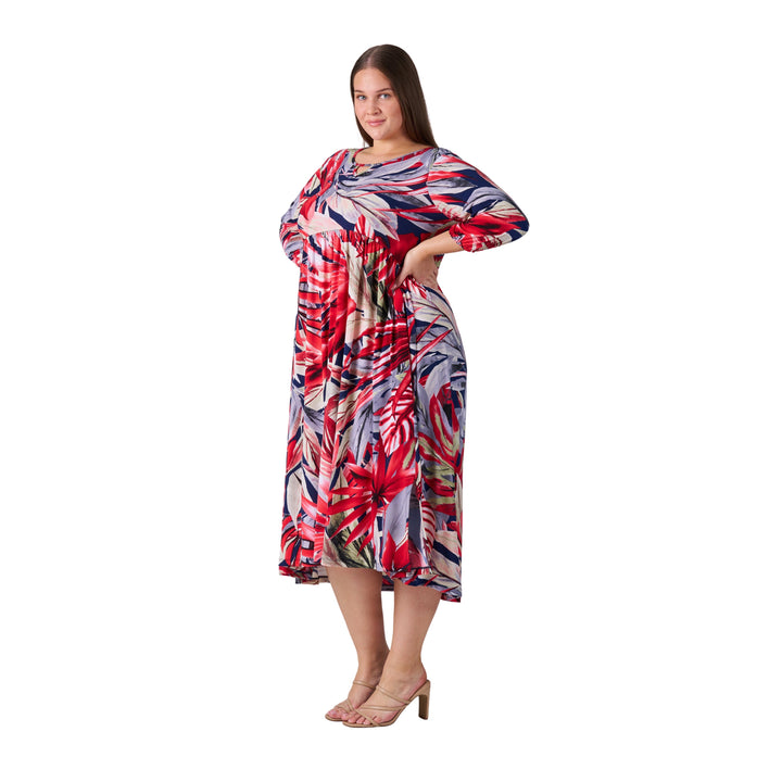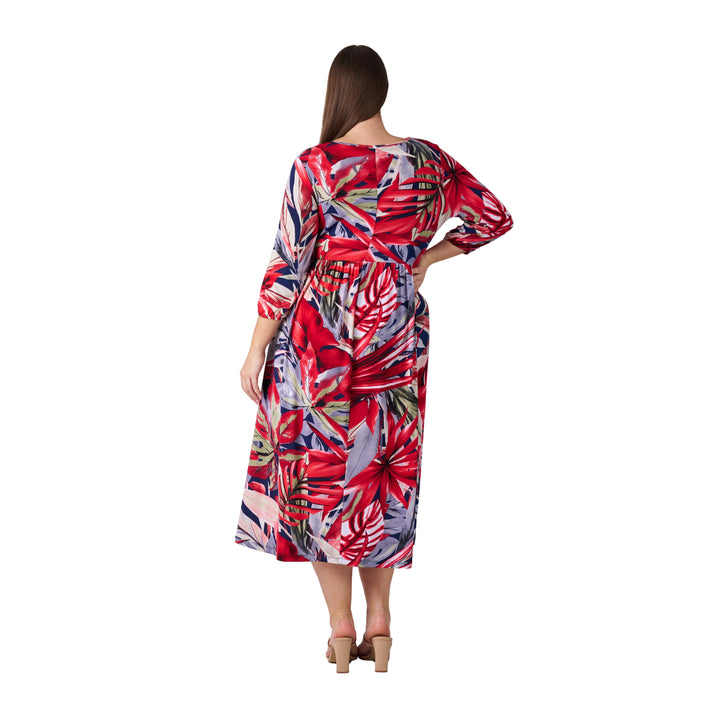Step out in vibrant style with our Tropical Dream Midi Dress, a perfect blend of comfort and eye-catching design. Featuring a bold, lush botanical print in striking shades of fiery red, navy, grey, and a touch of green, this dress is an instant mood-booster. The flattering midi-length hemline and 3/4 sleeves make it a highly versatile piece.